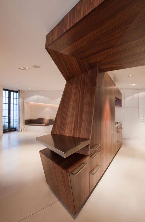 The 2010 Hamburg loft has evolved since their similarly designed 2005 Loft Gleimstrasse in Berlin (shown below). Although similar conceptually, and equally sculptural, the Hamburg loft has more angular accents and planes as well as an added sophistication and elegance as a result of the materials used.