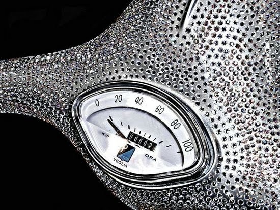 And thanks to Born Rich, I discovered this blinged out Vespa made by German company Stonerichworld. The 1961 Vespa VVB 150 is covered in 150,000 Swarovski crystals. It took four years for to develop a technique to apply the crystals without tearing down the underlining original paint and this scooter will run you a whopping $321,150.